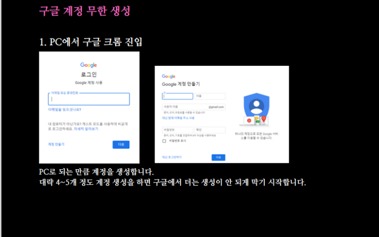 1.pc로 구글 깡통 계정 생성 횟수가 여러 번 되면 막힙니다.