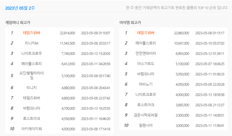 게임 재화 최신 일자 거래 최고가 순위(위 참조)